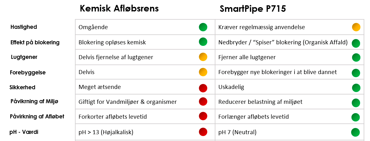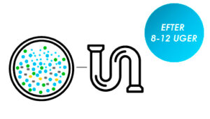 En traditionel/kemisk afløbsrens hjælper kun midlertidigt og eliminerer ikke selve problemet. Den umiddelbare blokering kan muligvis fjernes, men løsningen gør intet for det organiske affald eller slamaflejringer på rørets overflade – og derfor ingen langsigtet virkning.